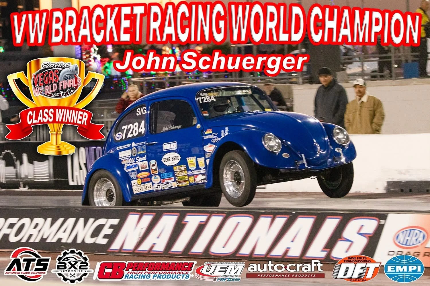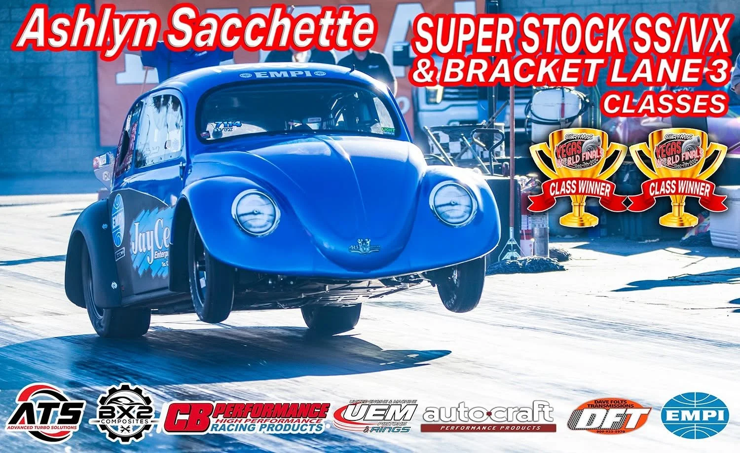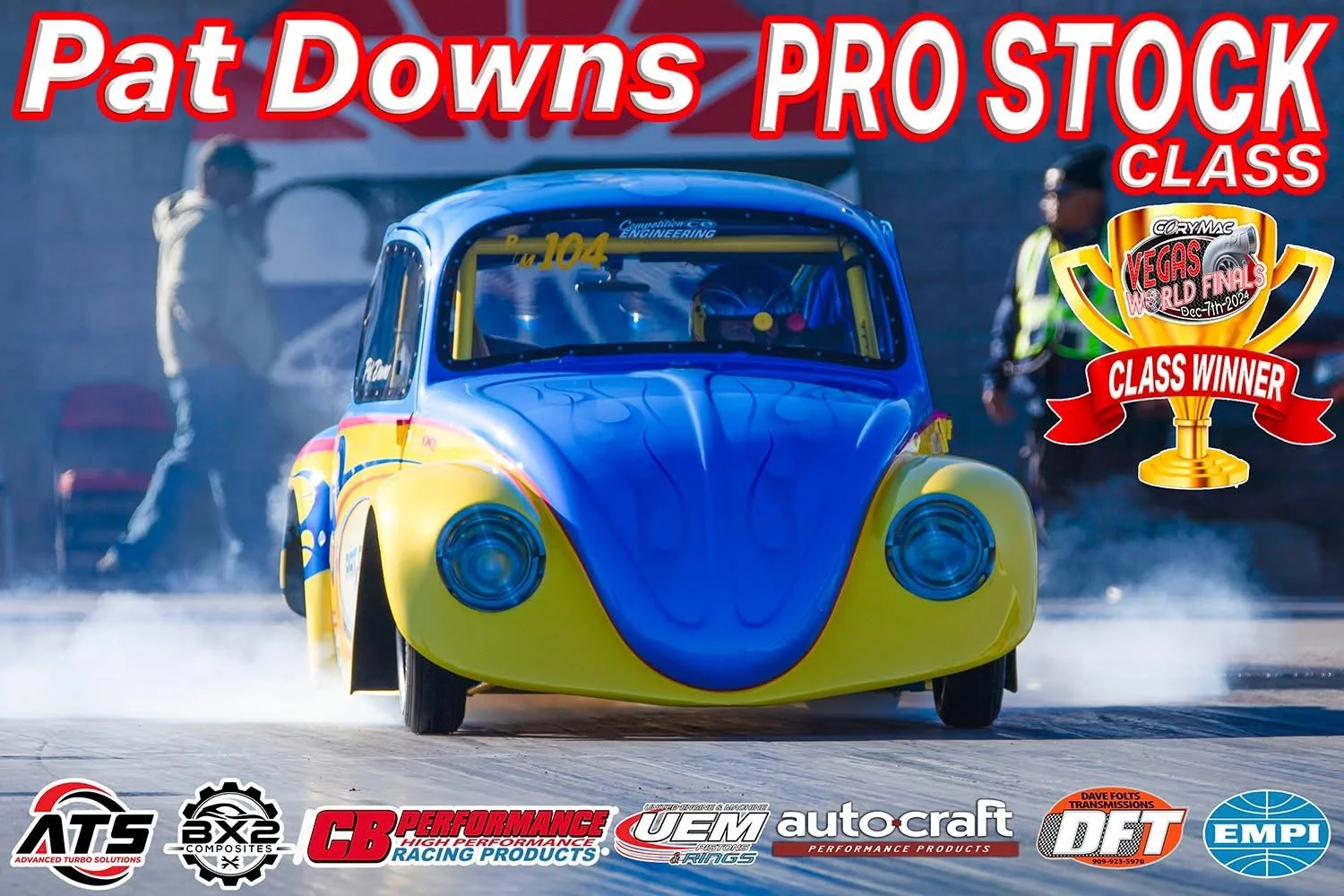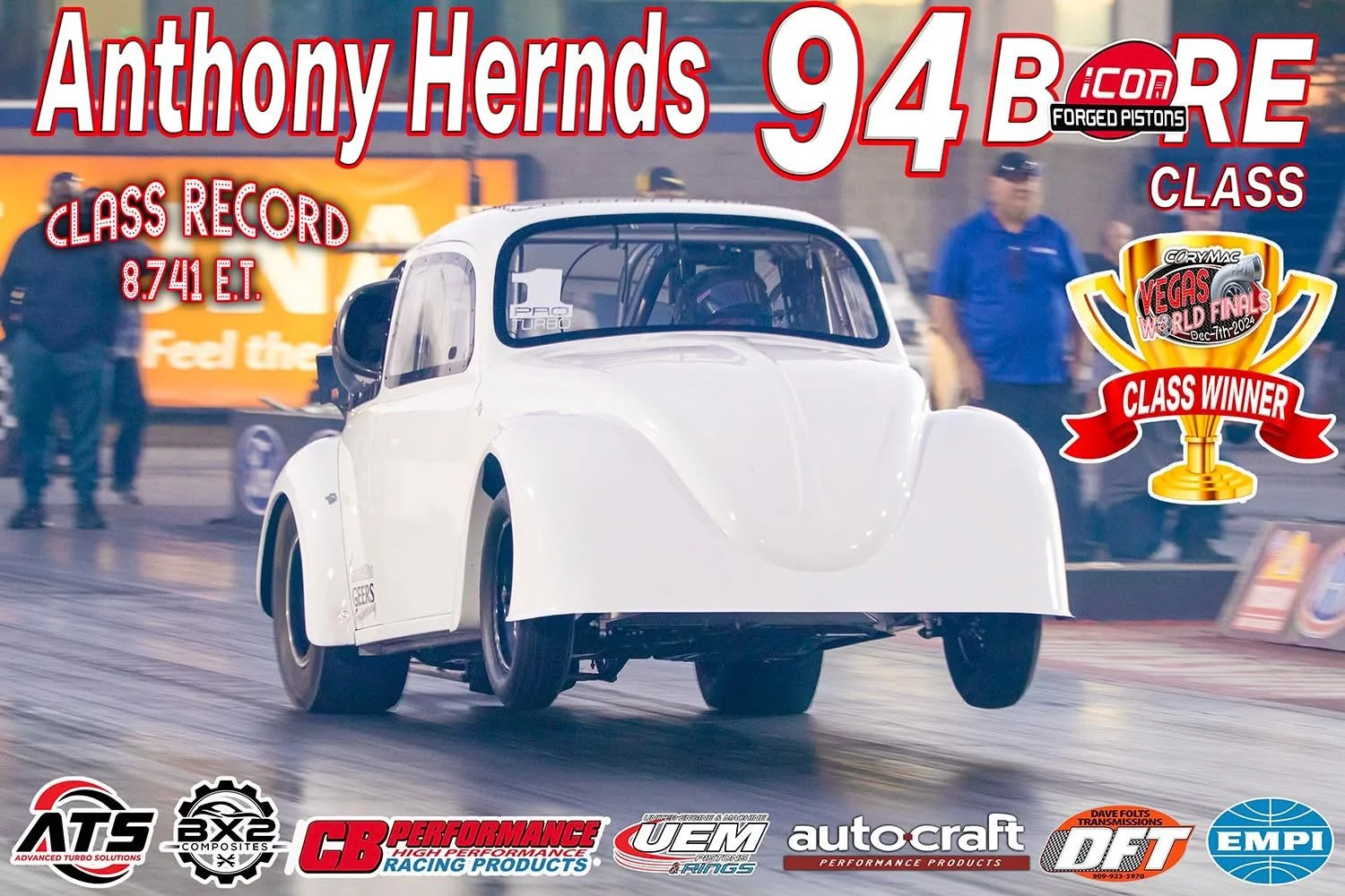 Built around the Iconic 94mm piston size, this class features turbocharged, high-performance Flat-4 engines built for one purpose: going all out in the quarter-mile. ALL NHRA SAFETY RULES, CERTIFICATIONS & LICENSES APPLY. Approved engine and transmission oil containment system required. Door cars and buggies only. Rear mounted, air-cooled flat 4 power only. 94mm bore max. Intercooler allowed on fuel injected only. Nitrous allowed on drawthrough only. Pan or chassis cars allowed. Winner engine inspection mandatory. 1/8 mile or 1/4 mile based on group consensus.